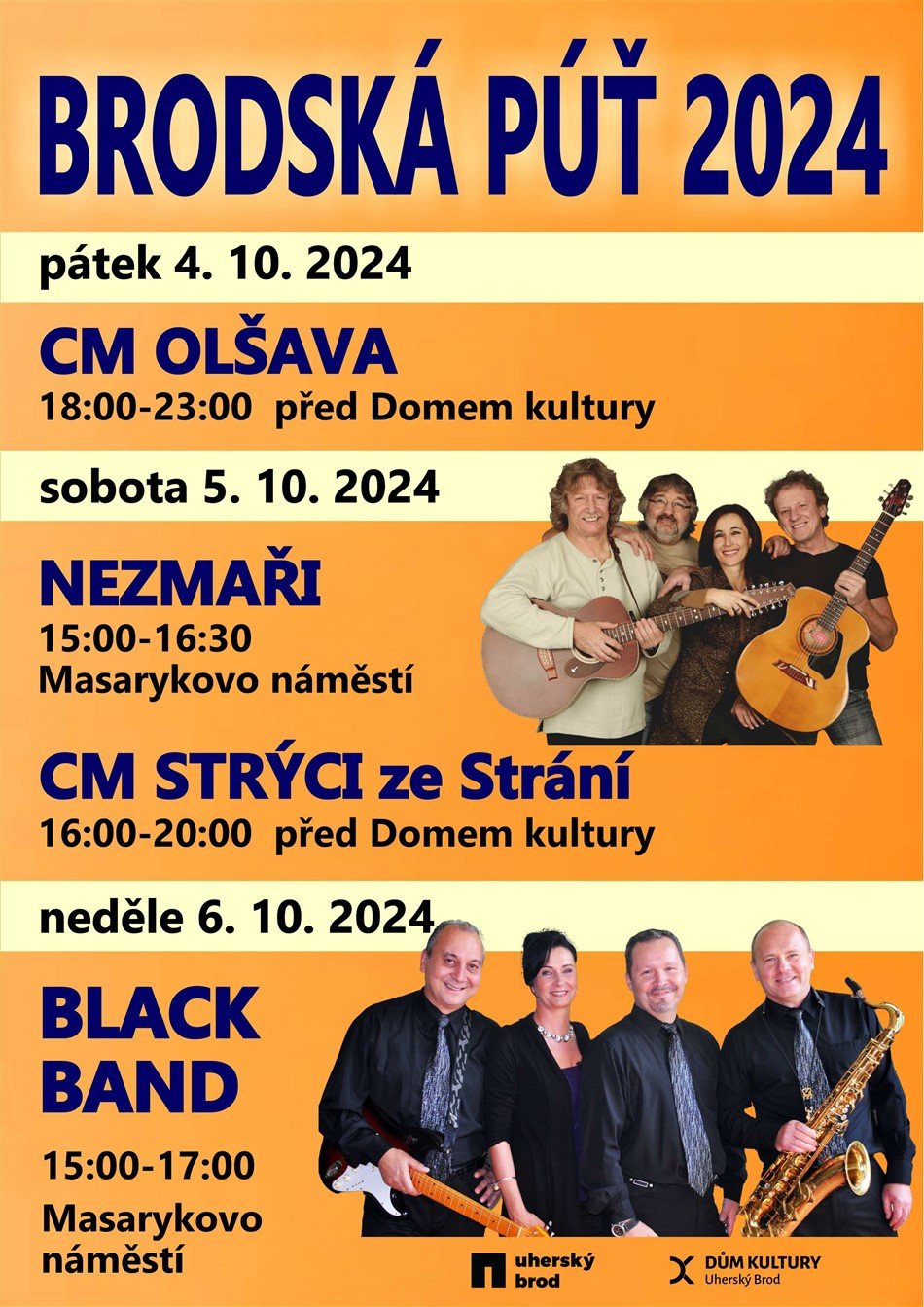Sobota 5. 10. Nezmaři (15:00–16:30, Masarykovo náměstí), CM Strýci ze Strání (16:00–20:00, před Domem kultury)