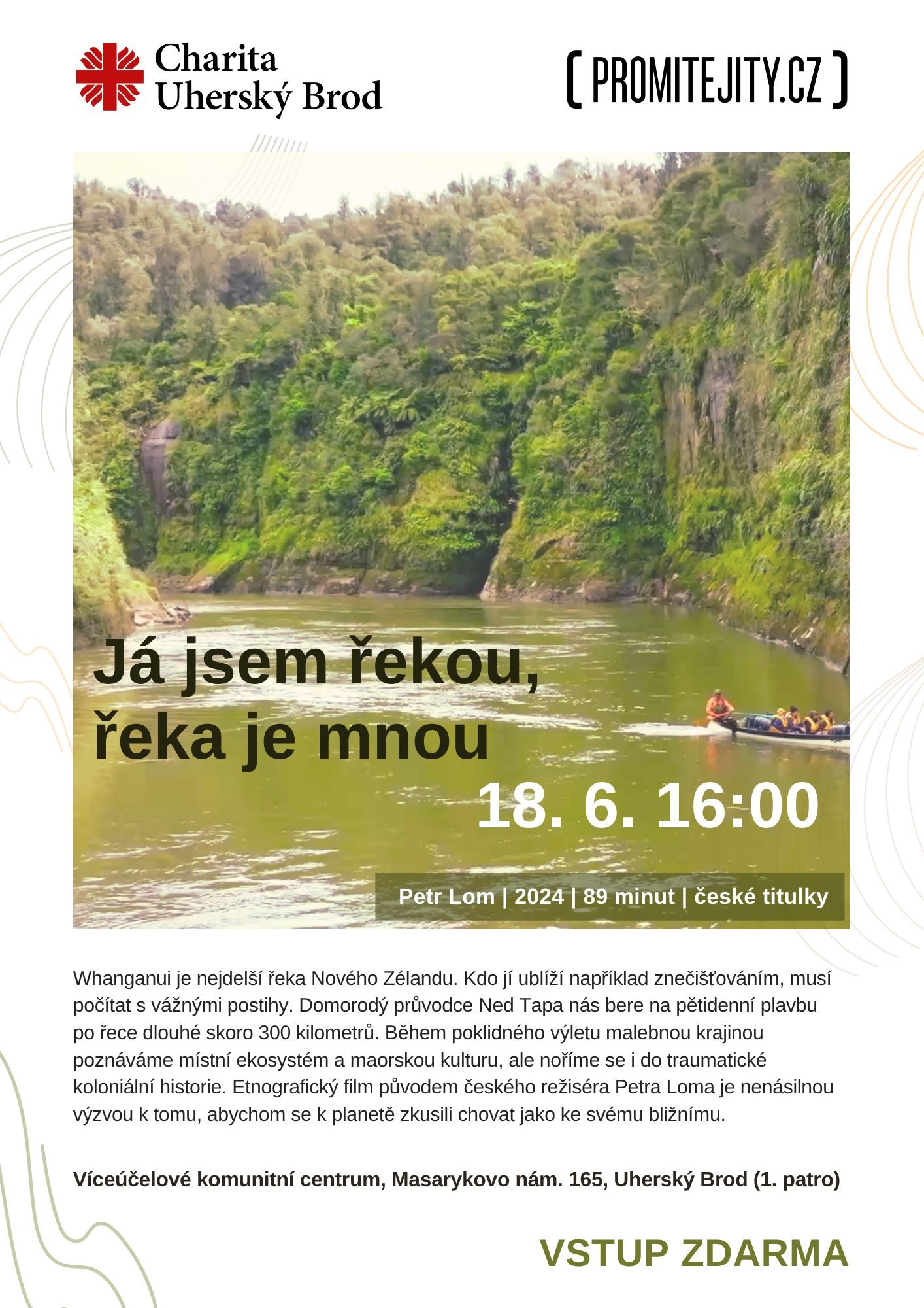Další díl ze série promítaných filmů od Promítej i ty! Tentokrát se můžete těšit na snímek "Já jsem řekou, řeka je mnou" o řece Whanganui - nejdelší řece Nového Zélandu. Etnografický film původem českého režiséra Petra Loma je nenásilnou výzvou k tomu, abychom se k planetě zkusili chovat jako ke svému bližnímu.