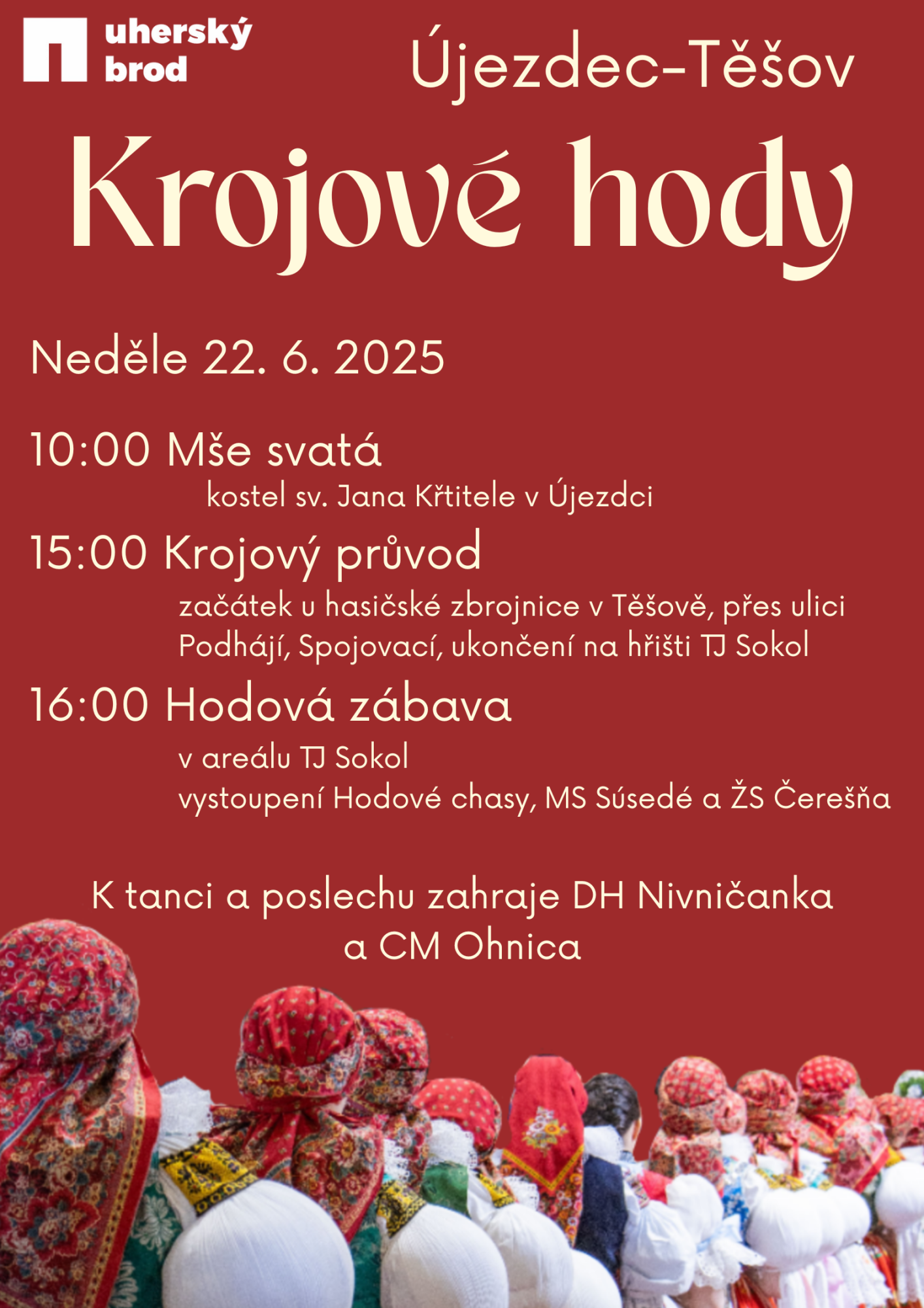 15:00 Krojový průvod – start u hasičárny v Těšově, ulicí Podhájí a Spojovací a končíme na hřišti TJ Sokol