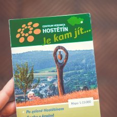 S mapou v ruce jsme se pak rozhodovali, jakou trasu pro výlet po okolí zvolit – buď zelenou (cca 1 km dlouhá stezka obcí – od obecní výtopny přes veřejné osvětlení, moštárnu, pasivní dům, sušičku ovoce až ke kořenové čistírně odpadních vod), nebo červenou okolo Hostětína (cca 6,5 km dlouhá trasa s celkem deseti zastaveními v podobě zajímavých dřevěných laviček s ocelovými prvky, která začíná za obecním úřadem a končí u vlakové zastávky). Poslední možností byla žlutá se sochami. Nakonec jsme se rozhodli právě pro žlutou.