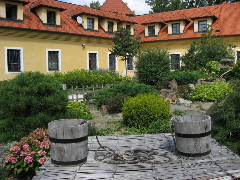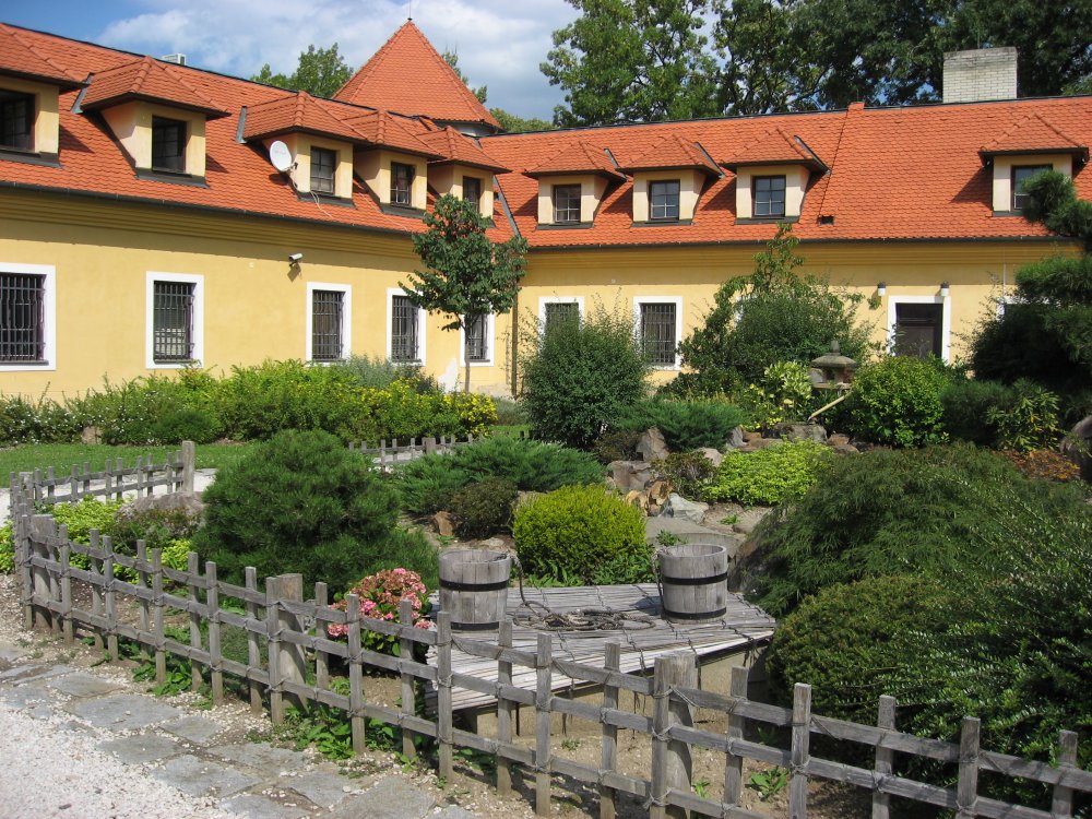 Der Garten wurde im Herbst des Jahres 1998 mit fünf japanischen Architekten geschaffen. Für seine Installierung wurde der Hof der Direktion des J. A. Komenský-Museums gewählt. Es handelt sich um einen Trockengarten, sog. „ Karesansui“, der eine Landschaft mit Bergen, Bäumen und Fluss symbolisiert, wobei das Wasser nur durch Kieselsteine oder Sand angedeutet wird. Für einen japanischen Garten sind Steine, die die Berge andeuten, Bambus, Nadelbäume und ausdrucksvolle Laubbäume charakteristisch.