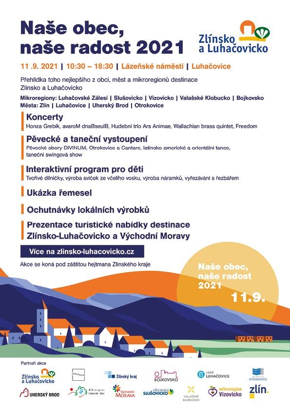 Turistická oblast Zlínsko a Luhačovicko se rozprostírá od Zlína a Otrokovic k Vizovicím, Valašským Kloboukám a Uherskému Brodu. Na jejím území najdete Vizovické vrchy i Bílé Karpaty, městskou turistiku Zlína nebo Uherského Brodu i lázeňství v Luhačovicích. Turistické cíle destinace, místní výrobci i jednotlivé regiony oblasti se představí na přehlídce Naše obec, naše radost už 11. září v Luhačovicích.