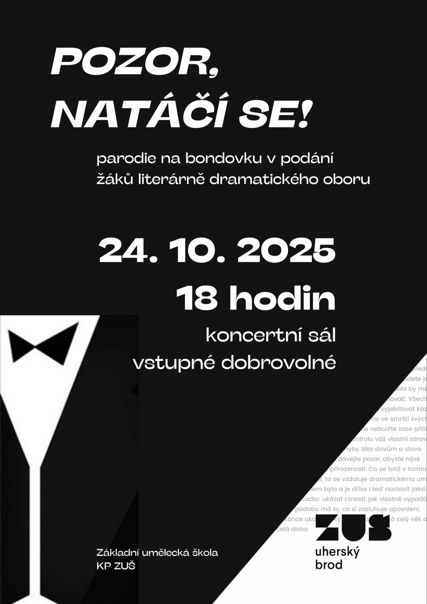 Přijďte strávit divadelní podvečer ve společnosti našich dramaťáků! Nebudete litovat! Parodie na bondovku vás zaručeně pobaví! Nebude chybět ani krásná blondýna a ikonické Martini.