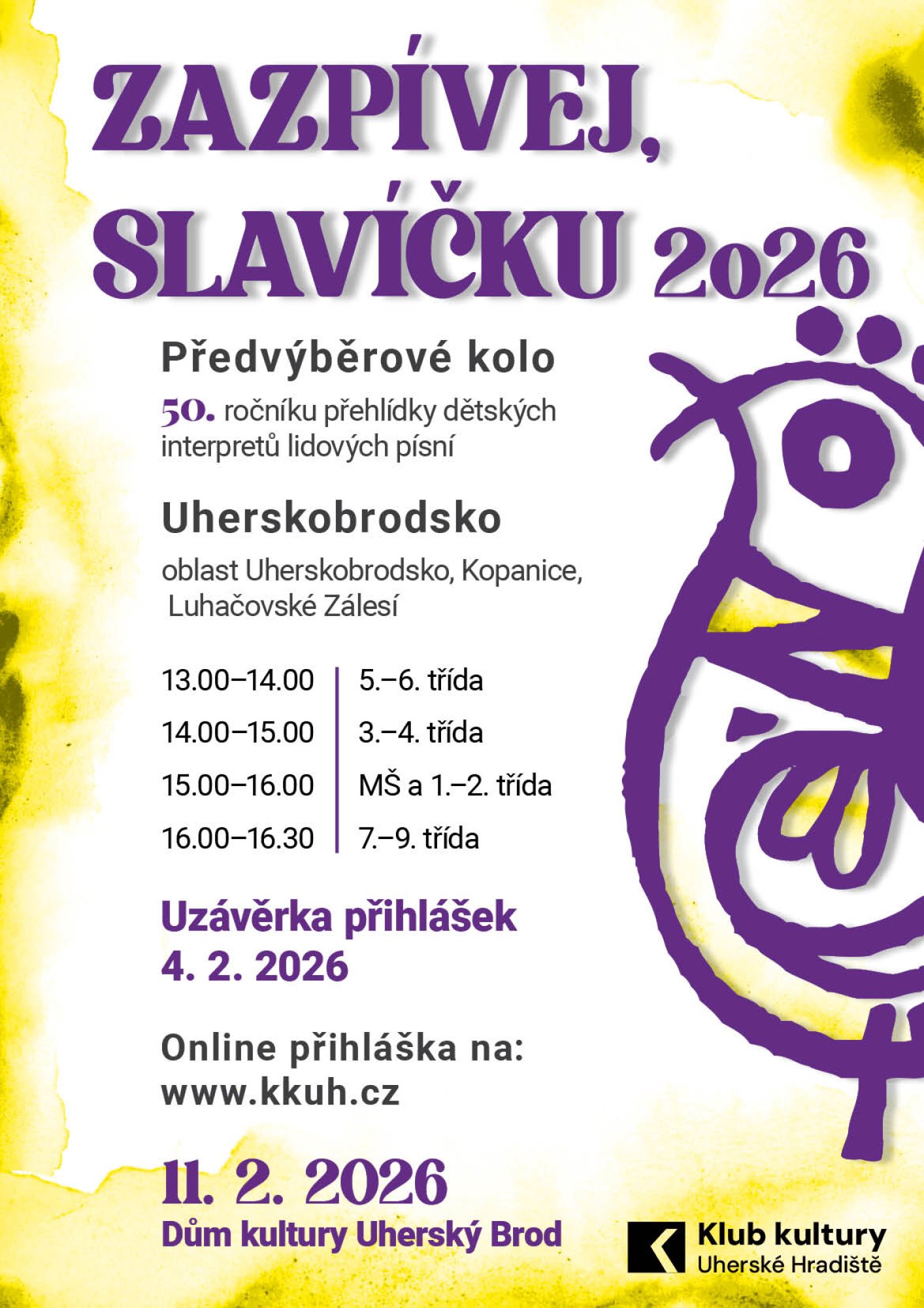 Vybrané děti z oblastních předkol postoupí do okresního finále ZAZPÍVEJ, SLAVÍČKU 2026, které se uskuteční v sobotu 21.3.2026 v Redutě v Uherském Hradišti.