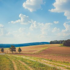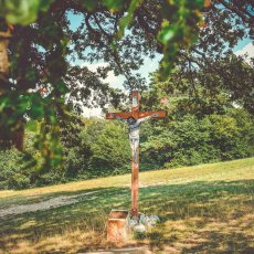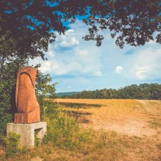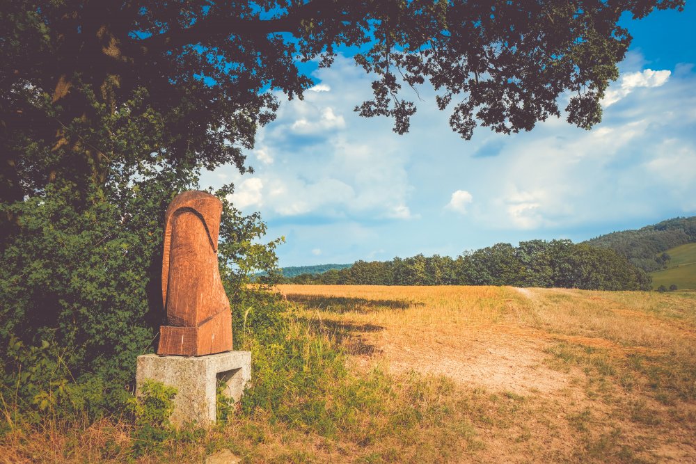 Od informačního střediska jsme se tedy vydali doleva po hlavní silnici a na konci vesničky, kde silnice uhýbá doprava dál, jsme pokračovali rovně okolo kříže a poté dál polní cestou do mírného stoupání (kolem solárních panelů na pravé straně). Za vesnicí jsme se napojili na žlutou trasu značenou velkým „S“ ve žlutém kroužku a šli jsme vstříc prvním dřevěným sochám.