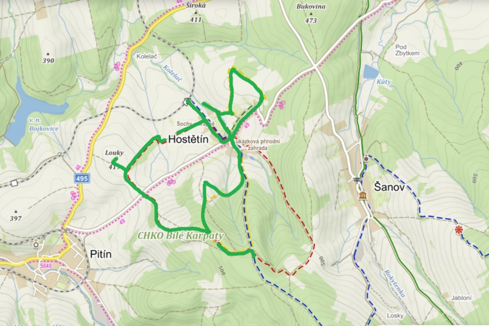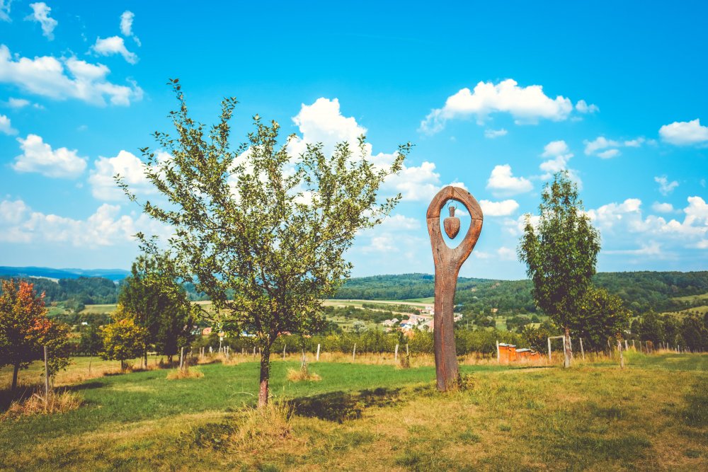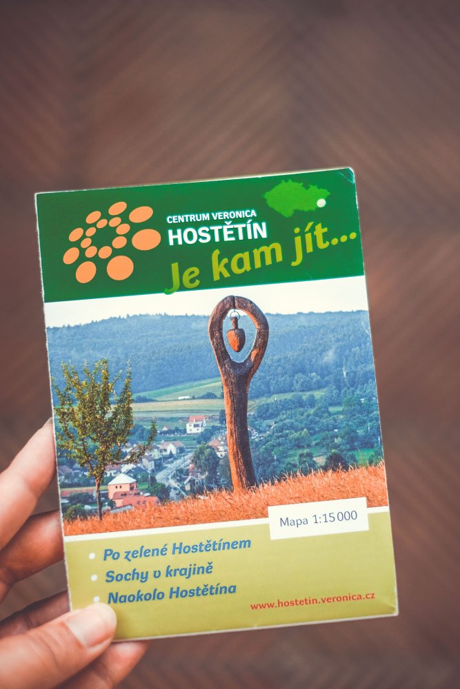 S mapou v ruce jsme se pak rozhodovali, jakou trasu pro výlet po okolí zvolit – buď zelenou (cca 1 km dlouhá stezka obcí – od obecní výtopny přes veřejné osvětlení, moštárnu, pasivní dům, sušičku ovoce až ke kořenové čistírně odpadních vod), nebo červenou okolo Hostětína (cca 6,5 km dlouhá trasa s celkem deseti zastaveními v podobě zajímavých dřevěných laviček s ocelovými prvky, která začíná za obecním úřadem a končí u vlakové zastávky). Poslední možností byla žlutá se sochami. Nakonec jsme se rozhodli právě pro žlutou.