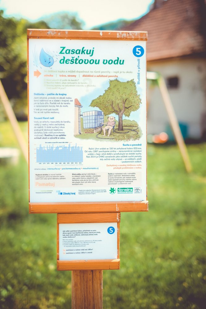 Tato první část okruhu byla dlouhá asi 2 kilometry a trvala nám tempem procházkové chůze necelých 40 minut. Trasa byla nenáročná – myslím, že by se dala zvládnout i s kočárkem. Velmi se nám líbilo, že jsme cestou potkávali spoustu lidí, kteří se o obec a její zařízení starají – u solárních panelů montéry, u kořenové čističky a studny u sochy „Adam a Eva“ zaměstnance údržby a dva pracovníky, kteří zde právě sekali trávu. Cítili jsme na sobě absolutní harmonii a určité splynutí s přírodou.