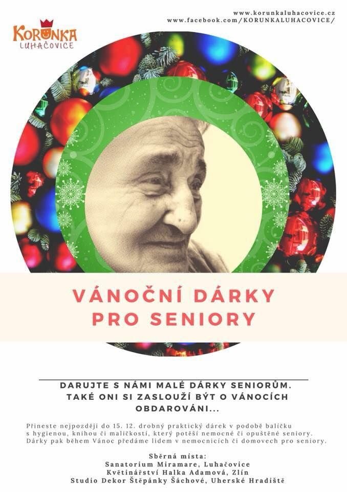 Zapojili jsme se do akce neziskové organizace Korunka Luhačovice. Sbíráme vánoční dárky pro nemocné nebo osamocené seniory. Pokud chcete i Vy věnovat knížku, kosmetický balíček nebo jinou maličkost, můžete do pátku 15. prosince nosit zabalené dárečky do Městského informačního centra.