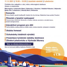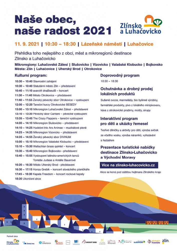 Turistická oblast Zlínsko a Luhačovicko se rozprostírá od Zlína a Otrokovic k Vizovicím, Valašským Kloboukám a Uherskému Brodu. Na jejím území najdete Vizovické vrchy i Bílé Karpaty, městskou turistiku Zlína nebo Uherského Brodu i lázeňství v Luhačovicích. Turistické cíle destinace, místní výrobci i jednotlivé regiony oblasti se představí na přehlídce Naše obec, naše radost už 11. září v Luhačovicích.